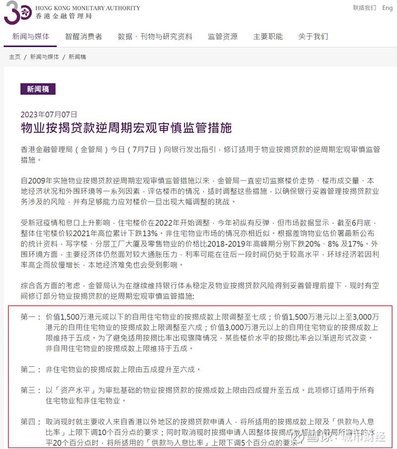 现在调整为,1500万港元以下的住宅,可以贷款70%,也即首付比例从之前的50%降至30%。