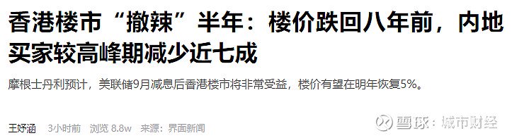 界面新闻对此报道的新闻标题是,“香港楼市“撤辣”半年:楼价跌回八年前,内地买家较高峰期减少近七成”。