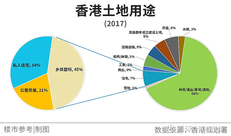香港目前的土地中有66%是闲置。被使用的34%的土地中,用于住宅建设的仅占7%。而在这7%的用于住宅建设的土地中,34%是私宅,21%是公屋,45%是乡郊居所。