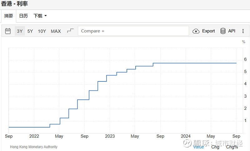 屋漏偏逢连夜雨,美国在2022年开启加息浪潮。而港元与美元在联系汇率制下深度绑定。利率从2022年年初的0.5%一直加息至如今的5.75%。