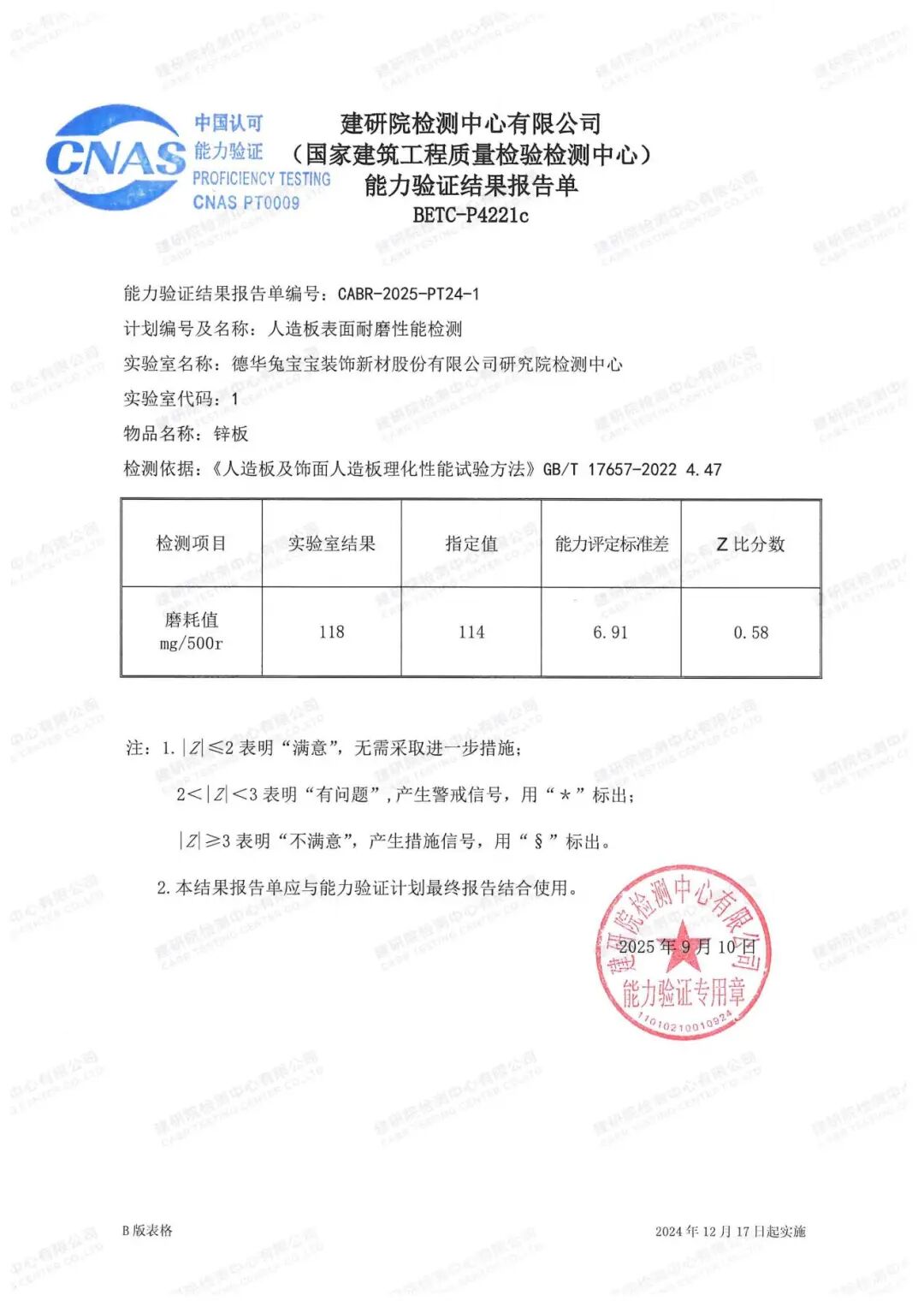 此次能力验证项目经中国合格评定国家认可委员会(CNAS)认可,具备高度的专业性与公信力。检测中心在此次验证中的检测结果Z值仅为0.58(|Z|≤2即为满意),远优于满意阈值,结果的精准性和可靠性充分展示了公司在人造板表面性能检测领域的深厚技术积累和卓越质量控制水平。