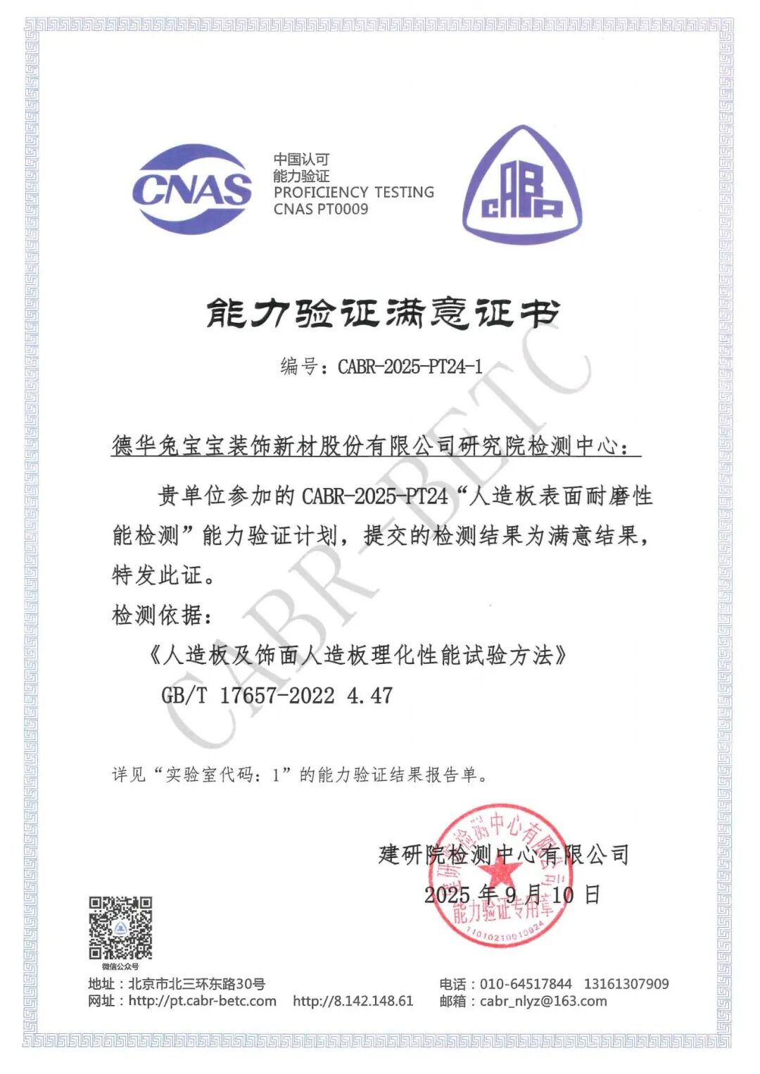 近日,兔宝宝研究院传来喜讯:在由建研院检测中心有限公司组织的“CABR-2025-PT24人造板表面耐磨性能检测”能力验证中,兔宝宝研究院检测中心(以下简称“检测中心”)以精湛的技术和严格的流程,成功通过验证,专业实力再获权威背书。